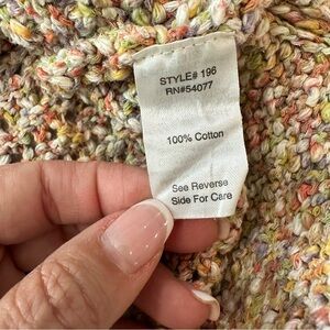 Textured, open-weave boucle knit with a soft rainbow blend. Scoop neckline, short sleeves, and stretch hem. Effortless layering piece for spring or fall.