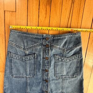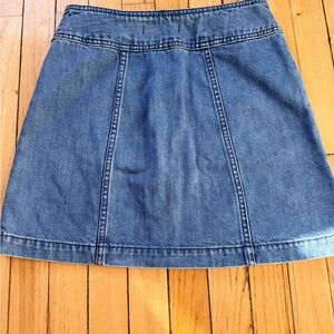 Chic A-line mini denim skirt with button-front. Features stylish front pockets. Ideal for everyday wear.