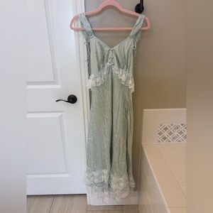 Free People x For Love and Lemons Mint slip dress. Inspired by vintage Parisian lingerie this midi dress exudes old time charm. Crafted in a floral jacquard with lace detailing and a self tie corset back. Cut on the bias Midi length. Size XL. New with tags attached