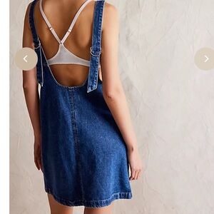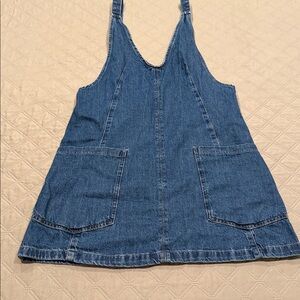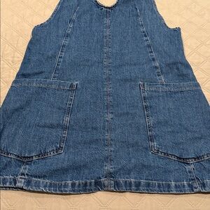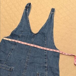Chic denim overall dress. Features deep pockets. Ideal for casual wear.