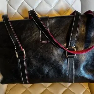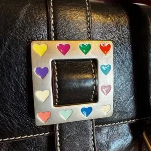 Stylish black leather Dooney and Bourke women's bag featuring colorful bright pink heart accents. Strong magnetic closure. Perfect for adding a touch of fun to any outfit. Measures 13 inches long, 9 inches tall, 5 inches wide. 12 inch handle drop.