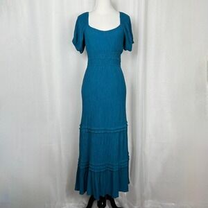 Max Ash Womens Tiered Midi Dress Medium Teal Regency Milkmaid Cottage Crinkled