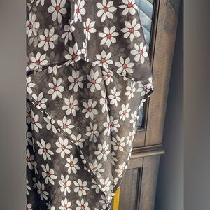 Made from a soft, sheer fabric with a delicate daisy pattern, it features an open front and stitched sides.