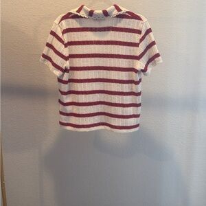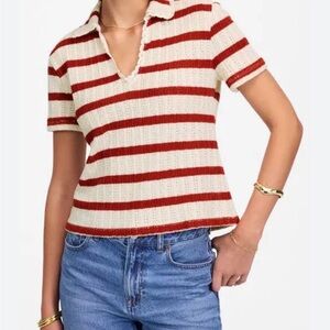 Chic and casual striped top. Features red and cream colors. Perfect for everyday wear.
