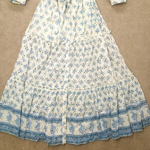 Hemant Nandita Womens XS XSMALL Blue White Boho Floral Eyelet Belted Maxi Dress