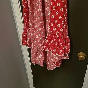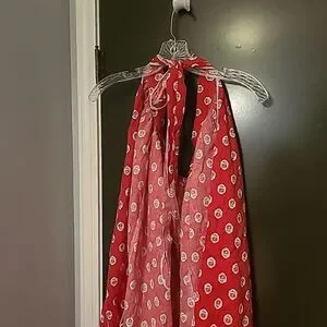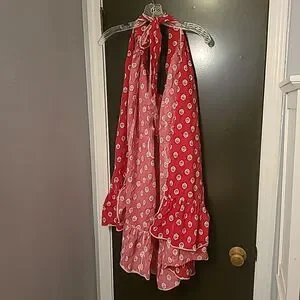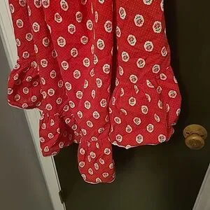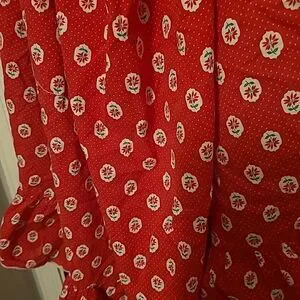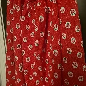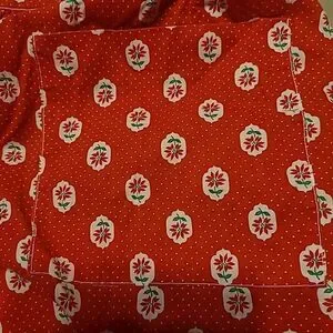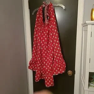 Pre-owned in good condition. Long red floral Apron tht ties in the back and has a patch pocket on the right side.
