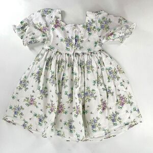 Vintage-inspired floral dress crafted from a textured seersucker fabric with a delicate purple and blue botanical print. This charming piece features a square neckline, puffed short sleeves with elasticized cuffs, and a gathered empire waist that flows into a full skirt. The back is finished with a classic button-down closure, untreated spot near bottom (see photo).