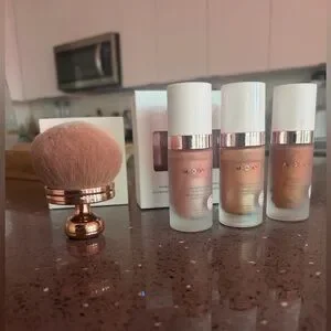 Discover the perfect finish with Monat Shimmering Radiance Body Luminizer Set. Includes light, medium, and deep shades for versatile coverage. Ideal for all skin tones. Beautiful coverage, non transferable color, golden glow. Body brush is incredibly soft and easy to buff color on evenly and easily. Only tried a couple drops on my wrist one time so it’s basically brand new! Been kept in its box. Get your glow on. Perfect for summer nights.