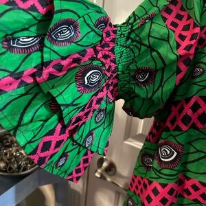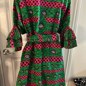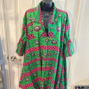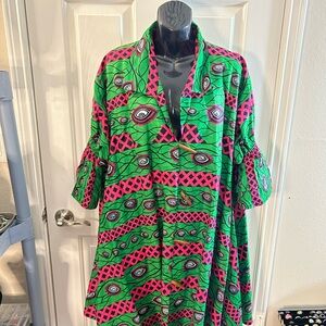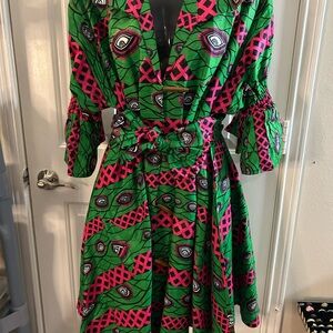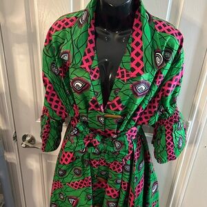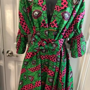 Stand out in this vibrant African Print green and pink dress. The head wrap material can be used as a belt. The head wrap will not fit all waist sizes! Perfect for any occasion, this dress combines style and comfort effortlessly. This material must be dry cleaned, washed in cold water and air dry only! This dress can fit Small to 1X! I’m Plus Size I can wear it. However the head wrap will not fit my 2X waist. You can also wear this dress like an open jacket with dress pants. You are welcome to ask questions about different ways you can wear this dress. All Sales are Final!