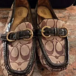 Elegant Coach loafers with signature pattern in brown and tan. Tan fabric with brown leather trim. Gold buckle detail adds a touch of luxury.