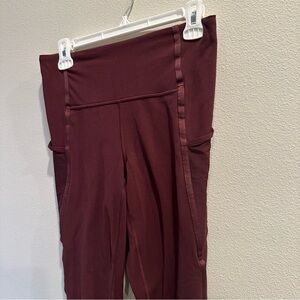 Sleek maroon leggings with mesh accents. Ideal for active wear.