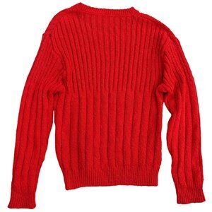 This vintage Woolrich sweater is knit from 100% cotton in a rich, saturated red with a classic vertical‑rib texture. Made in the U.S.A. and marked with Woolrich’s WPL 6635 label, the piece dates to the late 1980s or early 1990s, a period when the company produced durable, American‑made knitwear designed for outdoor wear and everyday use.