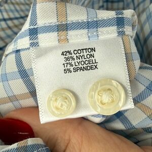 Crown Lite button-down shirt crafted from a premium blend of cotton, polyester, and Tencel fibers for a lightweight, breathable feel with added stretch for mobility. This long-sleeve shirt features a classic blue and tan plaid pattern, a button-down collar, and a single chest pocket.