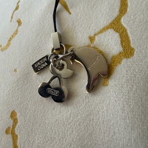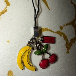 Coach keychain with silver banana and cherry charms. Sleek and stylish design.