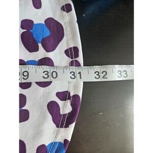 Modern leopard print dress featuring a white base with bold purple and cobalt blue spots. The Mitzi style includes a removable self-tie belt for waist definition and a relaxed, swing silhouette.