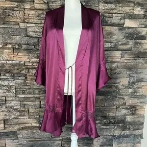 Indulge in the luxurious comfort of this Victoria's Secret robe, crafted in a rich purple hue. Designed with long sleeves and an open front, it offers a relaxed fit perfect for lounging. The flowing silhouette and soft fabric ensure a touch of elegance in your sleepwear collection. Robe is missing outside draw string.
