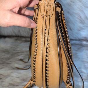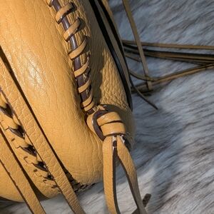 Condition: I used a suede eraser and brush on the inside for a gentle cleanse. Still has a few light marks here and there; see photos. I cleaned the exterior with leather cleaner and conditioned it. There is wear on the leather at the bottom front of the bag, nothing severe, just shows gentle use; see pic 6. A couple of strands of the fringe have some cracking edge coat, only really noticeable close up; see pics 11-12. The hardware shows some wear as well. The original strap looks like the edge coat was redone in some places and shows some wear, and I bought it with an extra, brown, thick leather strap that is in excellent condition.