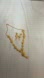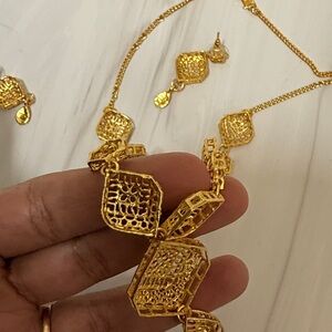 This exquisite gold jewelry set features a beautifully crafted necklace and matching earrings. Perfect for adding a touch of elegance to any outfit.