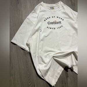 Rare Y2K Carhart graphic T-shirt, men’s XL white hard at work Carhart workwear since 1889. In good used condition very nice fade one small spot and pinhole as shown in pictures. Size and wash tag is super faded, but fits extra large. Please check photos for measurements bundle more items and save today.🙌