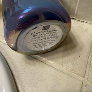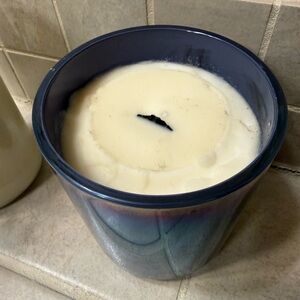 Surf's Up Candle with a blue label and a blue iridescent jar with a wooden lid. Both opened and 75% candle remaining.