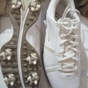 Step up your game with these sleek white women's golf shoes from Nike. Perfect for any occasion, they offer both style and comfort. Nike Air Dormie Women Golf Shoe White and Beige Leather Spike US Size 9.5