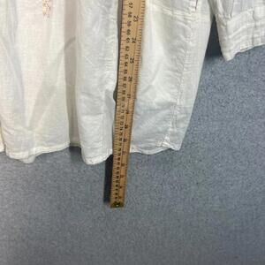 The Johnny Was White Vintage Rosa Long Sleeve Tunic Blouse in Women's size Small offers a relaxed fit with a round neckline and button closure. Made from lightweight cotton fabric, this geometric patterned blouse features embroidered accents, making it a perfect casual and bohemian style option for summertime and spring seasons. With its long sleeves and white color, this blouse from the Johnny Was brand is machine washable and easy to care for, making it a versatile and stylish addition to any woman's wardrobe.