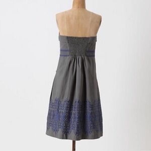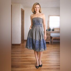 Gorgeous and truly unique vintage Anthropologie strapless midi dress in the most stunning soft gray with intricate blue embroidery at the bodice and hem. The silhouette is incredibly flattering - fitted through the waist with a below-the-knee, softly pleated skirt that moves beautifully.