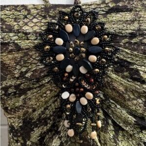 Chic strapless dress with snake print. Features earthy tones and elegant embellishments. Ideal for stylish outings. Wore once. EUC