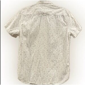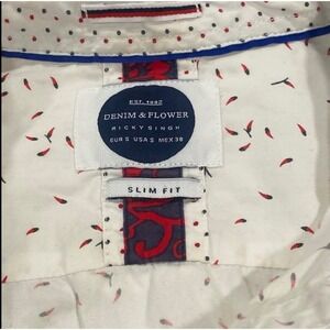 Denim & Flower by Ricky Singh men's short sleeve button-up shirt in size S. Cream/off-white base with small red chili peppers throughout. Slim fit styling with button-down collar. 100% cotton for breathable comfort. Contrast floral lining details. Good pre-owned condition. Made in India. Smoke-free home. Fast shipping!