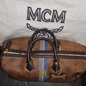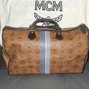 Elegant MCM duffel with signature logo pattern. Features blue stripe accent. Ideal for travel.