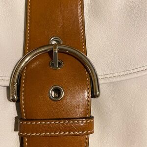 Chic Coach shoulder bag with a cream body and tan accents. Ideal for versatile styling.