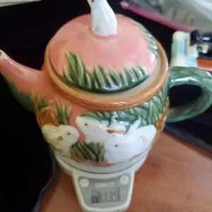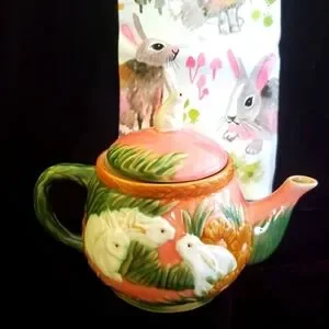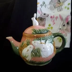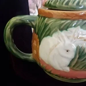 Condition is excellent no sign of use heavy weighted pot so no tipover Very Nice Whimsical Bunnies Playing While You Pour Your Favorite Beverage