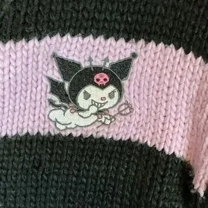 Cozy sweater with black and pink stripes. Features Hello Kitty patch. Button-up front.