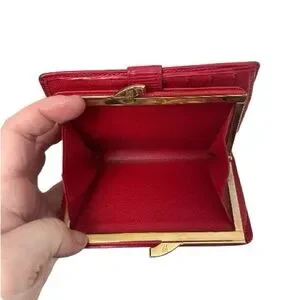 All corners are perfect, the outside folds of the wallet shows excellent as the is NO separation., kisslock coin pouch is clean. Has 4 card slots and behind that is two compartments for additional cards, etc. The first compartment show signs of wear but they are minimal, the 2nd compartment is fine.