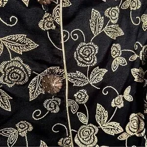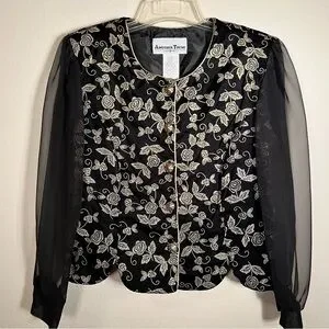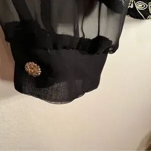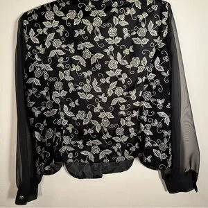 This top features floral embroidery that contrasts against its black base. The sheer sleeves add a touch of elegance. It has a fitted silhouette and cropped length.