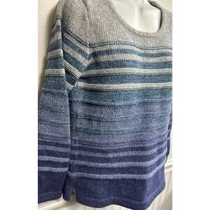 The LL Bean Cable Knit Ombre Fisherman Sweater for women in size small is a stylish and cozy addition to any winter or fall wardrobe. Made from cotton with a cable-knit style, this sweater features a round neckline and long sleeves, making it perfect for casual occasions. The ombre fisherman design in shades of purple, blue, and gray adds a classic touch to this pullover sweater, ideal for a comfortable and fashionable look.