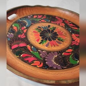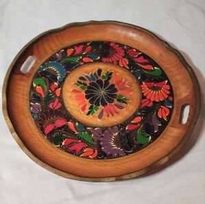 Beautiful wooden serving tray with vibrant floral design. Features a mix of colors including red, orange, green, and purple. Perfect for serving or as a decorative piece.