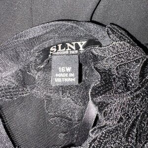 Chic black lace gown by SLNY. Features delicate lace design. Ideal for special events.