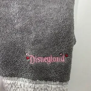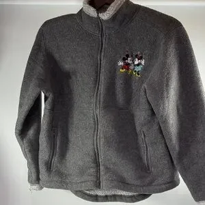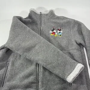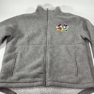 Cozy gray fleece jacket featuring Mickey and Minnie Mouse embroidery. Perfect for casual wear.