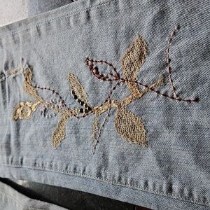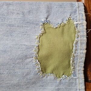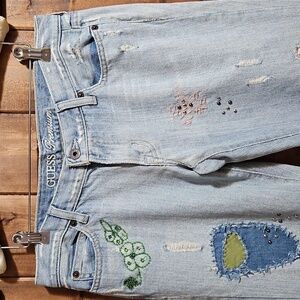 Guess Premium jeans, characterized by their light wash, distressed details, and various embellishments, including patches, embroidery, and sequins.