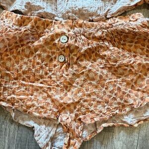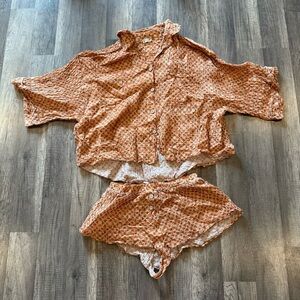 Used a couple of times but did air dried it. Comes from a smoke and pet free home. Perfectly paired and just as cozy, this sweet set features a boxy button-up shirt and coordinating lounge shorts in a vintage-inspired print.