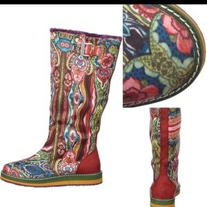 Vibrant knee-high boots with intricate patterns. Features a mix of red, green, and pink colors. Perfect for a bold fashion statement.