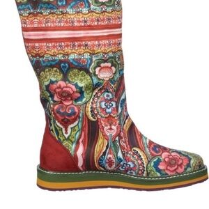 Colorful and vibrant knee-high boots with a colorful pattern. Features a mix of red, green, and blue hues.