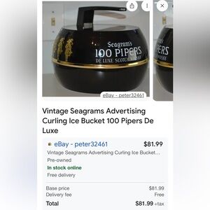 Seagram’s 200 pipers piping, deluxe Scotch, round ice bucket. Measures 10” long x 8.5” high.There is wear to the top of the lid. Please see pictures. Great for a man cave.
