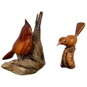 Handcrafted Wooden Bird Figurines On Rustic Wood Artsy Beachy MCM