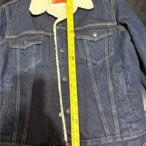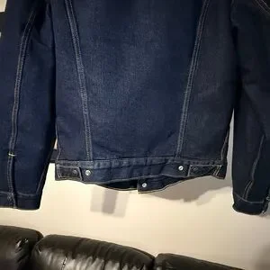 Classic Levi's jacket with cream sherpa lining. Dark blue denim. Ideal for layering.