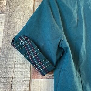 Features a flattering structured bodice with button detail, plaid trim on the collar and sleeves, and—yes—it has pockets!