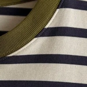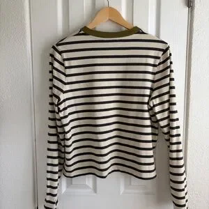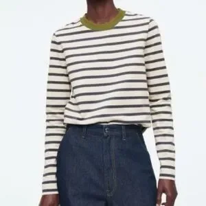 COS The Clean-Cut Stripe Long Sleeve Cotton T-Shirt. A classic T-shirt crafted from premium medium-weight organic-cotton jersey. Size Medium. Length: 22”. Regular fit. 100% Organic cotton. Machine wash. Color: Dark Grey and Ivory stripe w/Olive Green on Crew. Condition: NEW with Tags.
