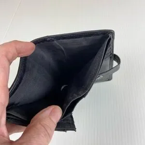 Fossil genuine leather bifold wallet in black with unique patchwork texture and silver-tone stud details.