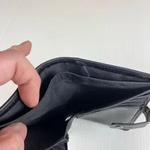 Features a snap tab closure and compact bifold design with an additional interior flap for extra card storage.
